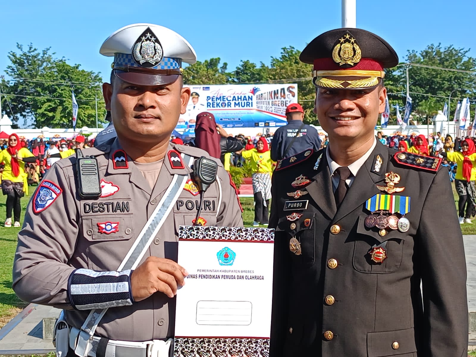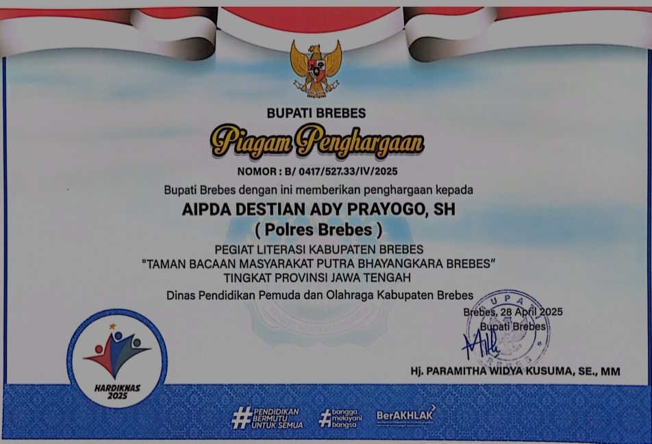 Brebes, Lidikkrimsus.co.id — Dalam rangka peringatan Hari Pendidikan Nasional, *Aipda Destian Ady Prayogo, S.H.* menerima penghargaan sebagai Pegiat Literasi Kabupaten Brebes. Penghargaan tersebut diserahkan langsung oleh Bupati Brebes, *Hj. Paramitha Widya Kusuma, SE., MM.*, dalam upacara resmi yang digelar di Lapangan Kantor Pemerintahan Terpadu pada Jumat pagi. 02/05/2025.