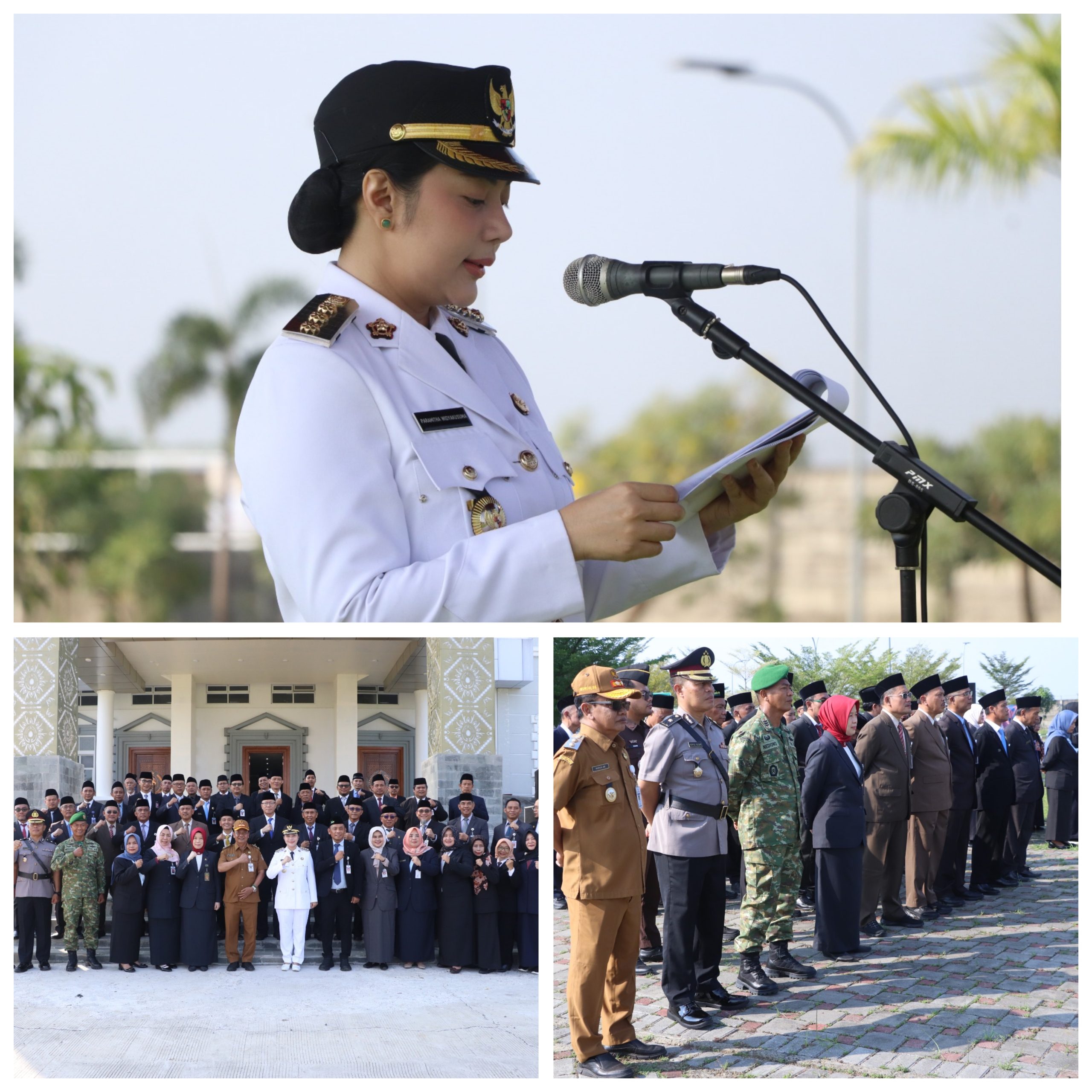 Bertindak sebagai Inspektur Upacara, Bupati Brebes Hj Paramitha Widya Kusuma SE MM membacakan sambutan tertulis Menteri Dalam Negeri RI Muhammad Tito Karnavian, di Halaman Kantor Pemerintahan Terpadu (KPT) Brebes, Senin (27/4/2026).